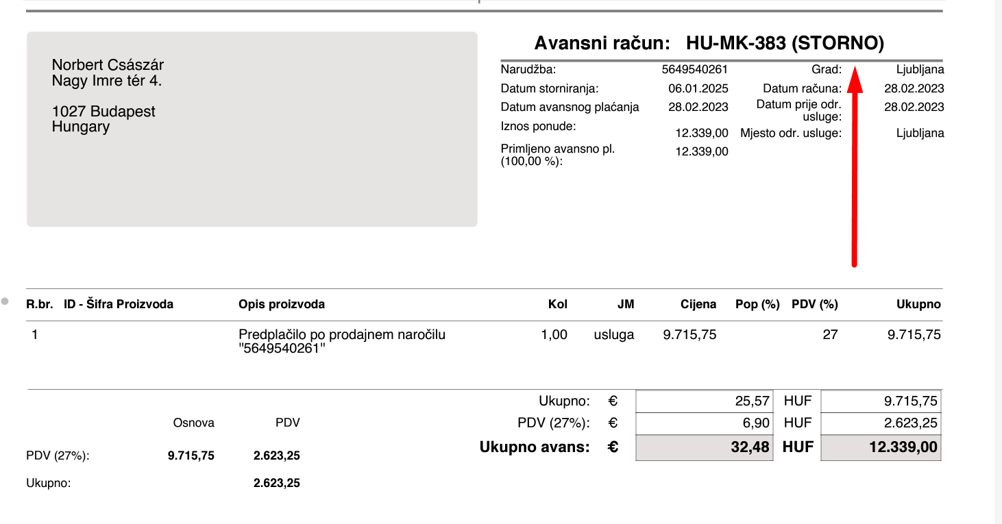 Kada potvrdite storno porezno potvrđenog avansnog računa, avansni račun će biti storniran, a istovremeno će biti izdana dodatna faktura, avansni račun s "negativnom" vrijednošću storniranog avansnog računa. U zagradi će biti navedeno (povrat storna).