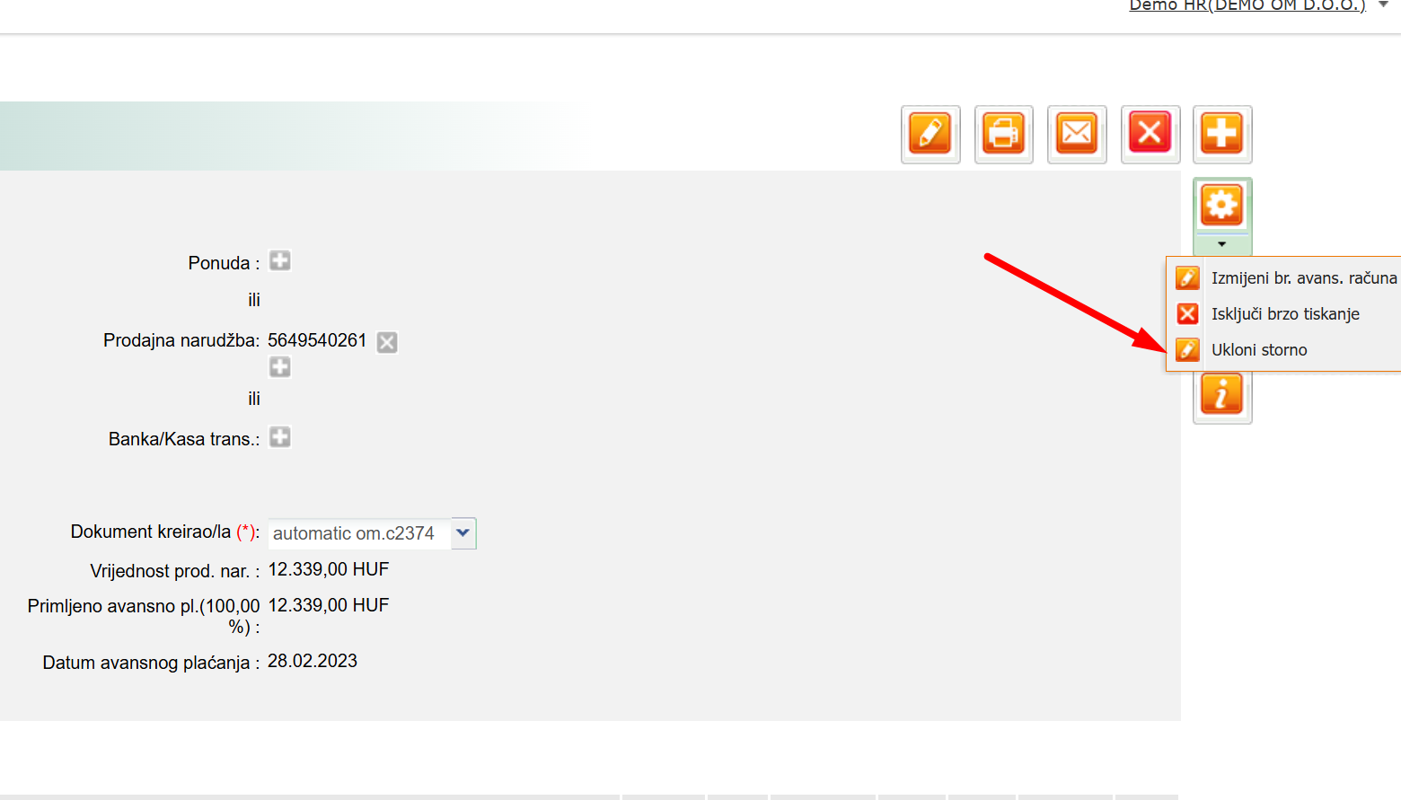 Storno avansnog računa moguće je i ukloniti, tako da odaberete avansni račun, kliknete na gumb "Alati" i odaberete opciju "Ukloni storno".