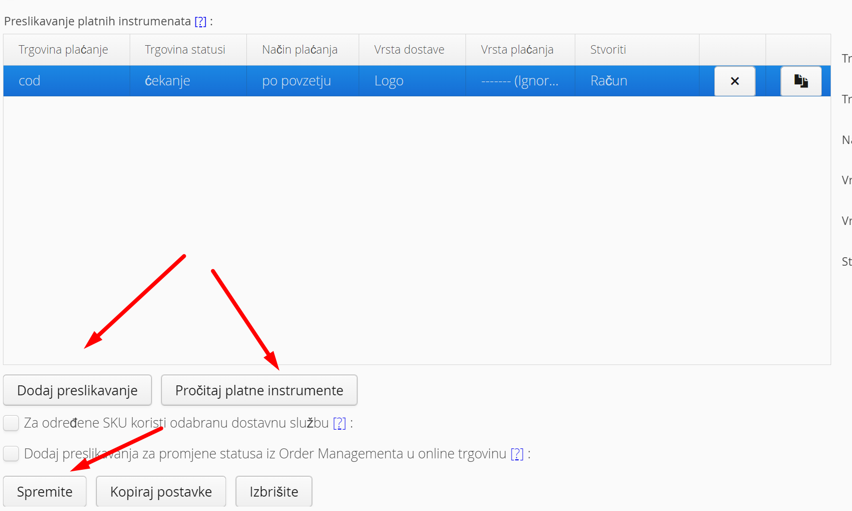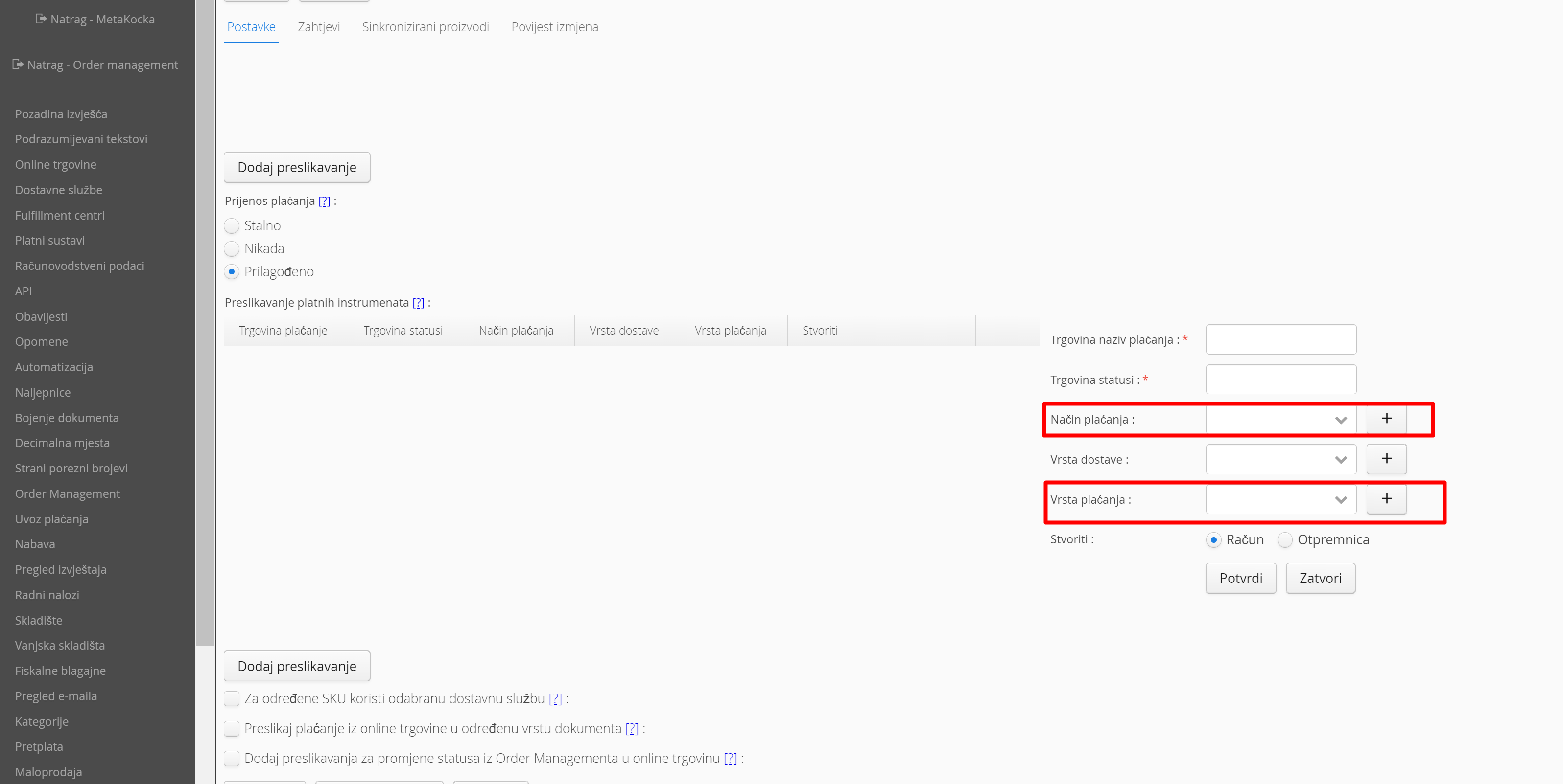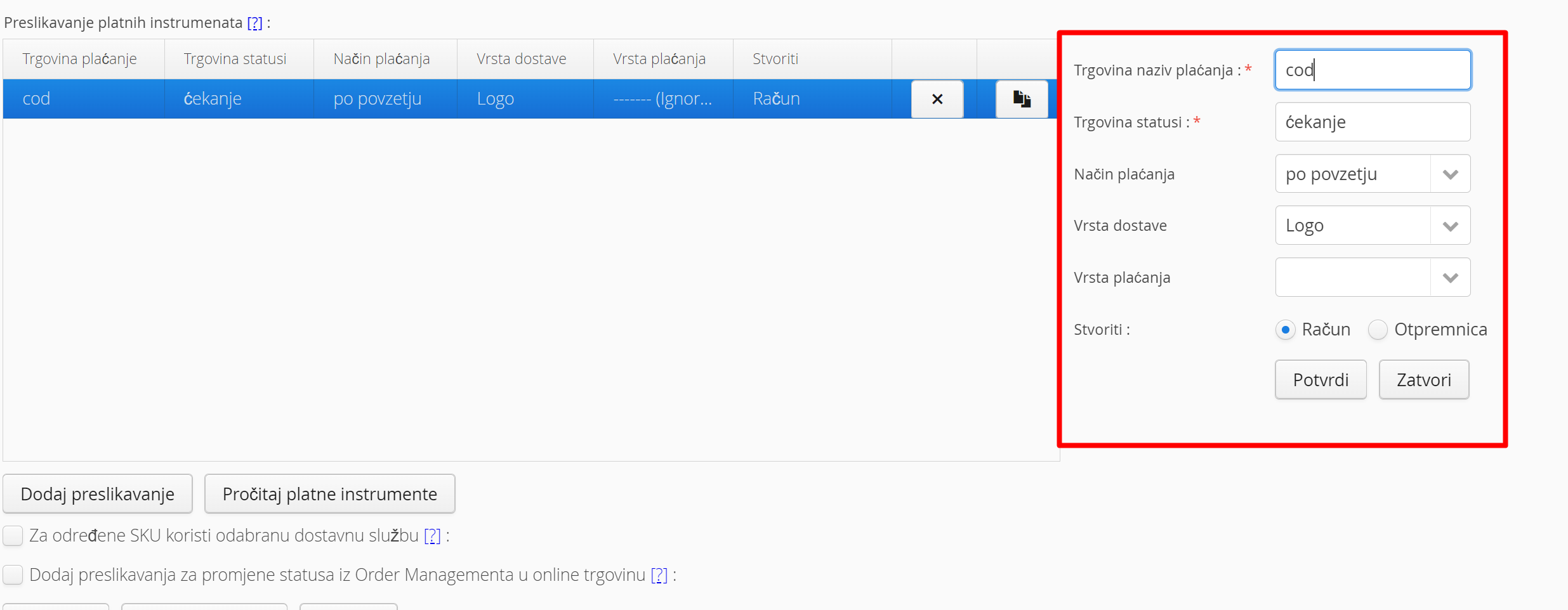 Za svaki platni instrument potrebno je podesiti uvjete pod kojim se narudžbe prenose u MK kao i kakvu oznaku će imati za Način plaćanja/Vrstu plaćanja: