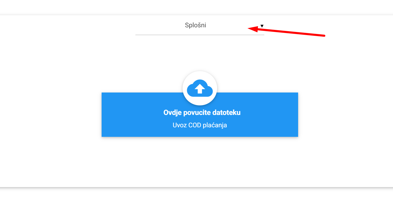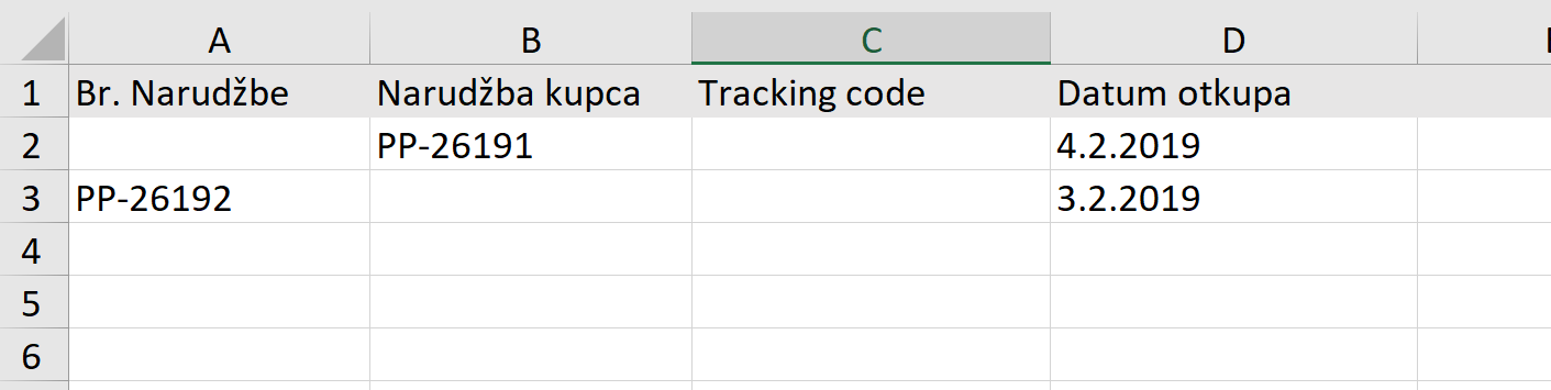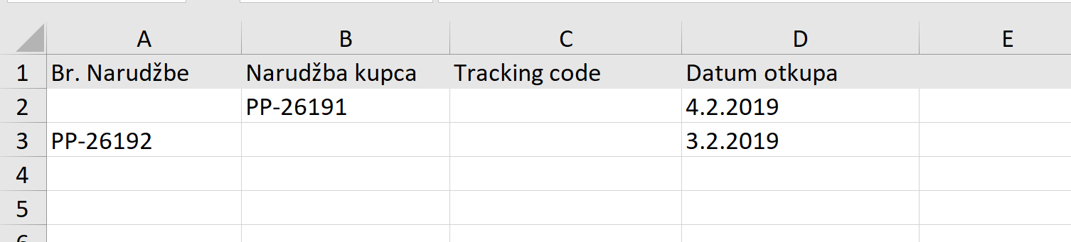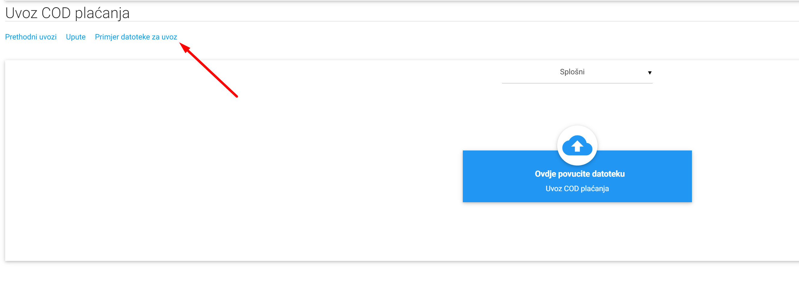 Predložak uvozne datoteke možemo prenijeti iz aplikacije klikom na ''Primer datoteke za uvoz'' (prikazano ispod). Važno je, da je upisan barem jedan identifikator narudžbe za koju smo primili otkupninu - br. narudžbe ili narudžba kupca iz online trgovine ili broj za praćenje (Tracking Code). Ako je u tabeli više upisanih podataka za istu narudžbu, usporedba se izvede od leve ka desnoj. Ako datum otkupnine nije naveden, onda je jednak današnjem datumu.