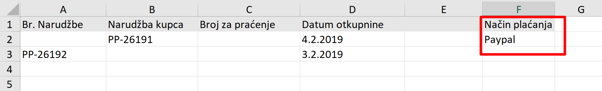 Ukoliko u stupac F upišete vrijednost Načina plaćanja, prilikom uvoza otkupnine će se u narudžbi ažurirati način plaćanja: