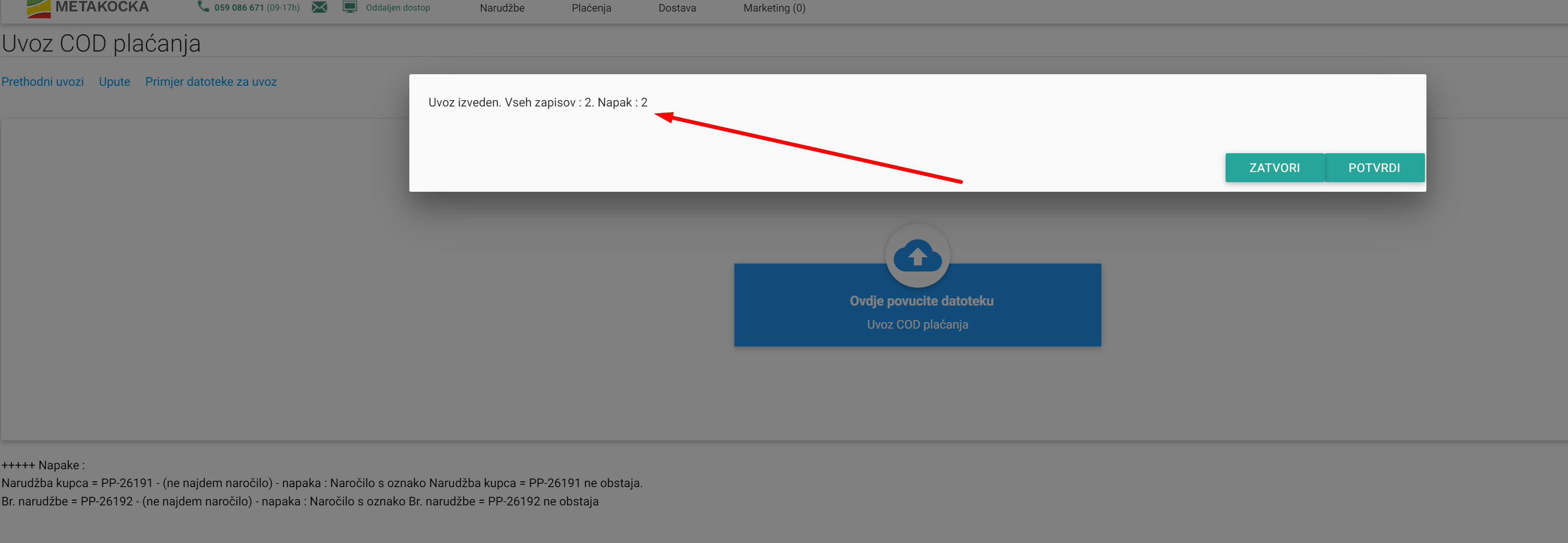 Po uspješnom uvozu se na narudžbi i računu označi da je plaćeno pouzećem sa naznačenim datumom (odnosno datumom uvoza, ako nije naznačen).