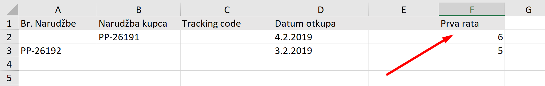 U Excelu vrijednost mora biti obavezno unesena u stupcu ''F'', dok stupac mora imati ime ''Prva rata''.