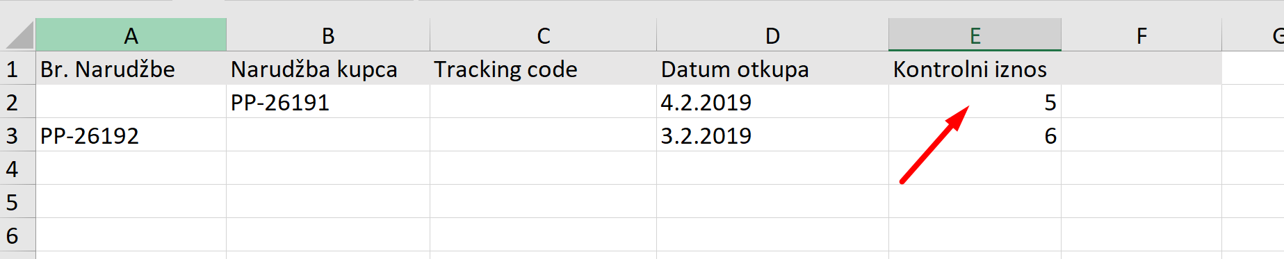 U Excelu vrijednost mora biti obavezno unesena u stupac ''E'', dok stupac mora imati ime ''Kontrolni iznos''.