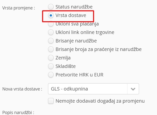 U "Nova vrsta dostave" odaberite vrstu dostave koja će izmijeniti prethodnu vrstu dostave za odabrane narudžbe.