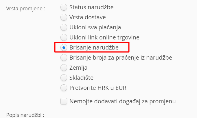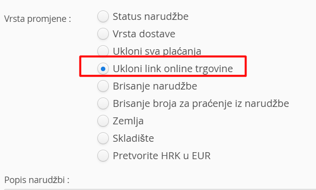 Omogućava uklanjanje veze između narudžbe i online trgovine. Na taj način, možete ponovno prenijeti narudžbe iz trgovine.