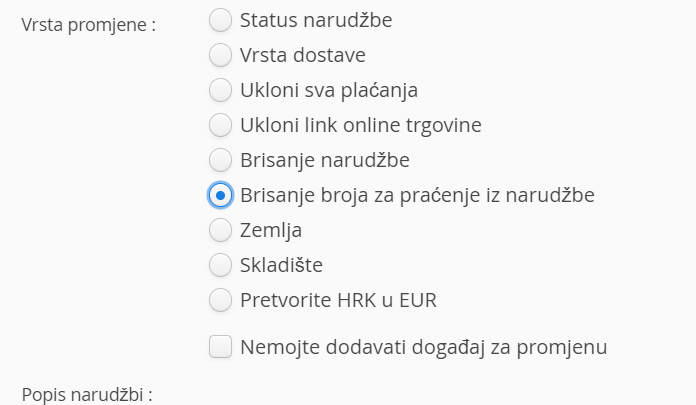 - Brisanje broja za praćenje iz narudžbe