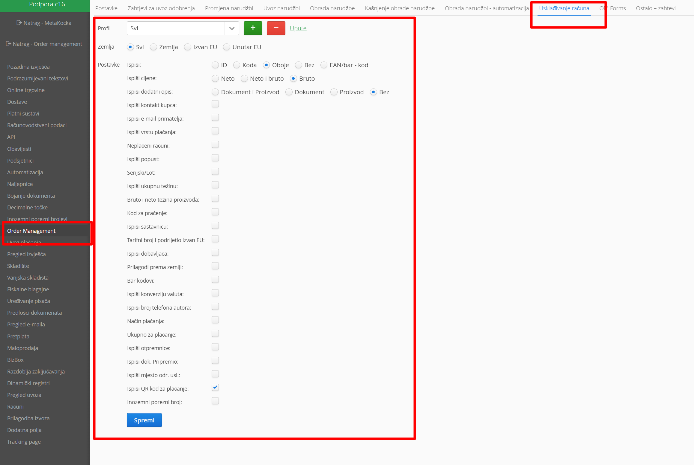 Dodatne postavke/ Order Managment/Usklađivanje računa