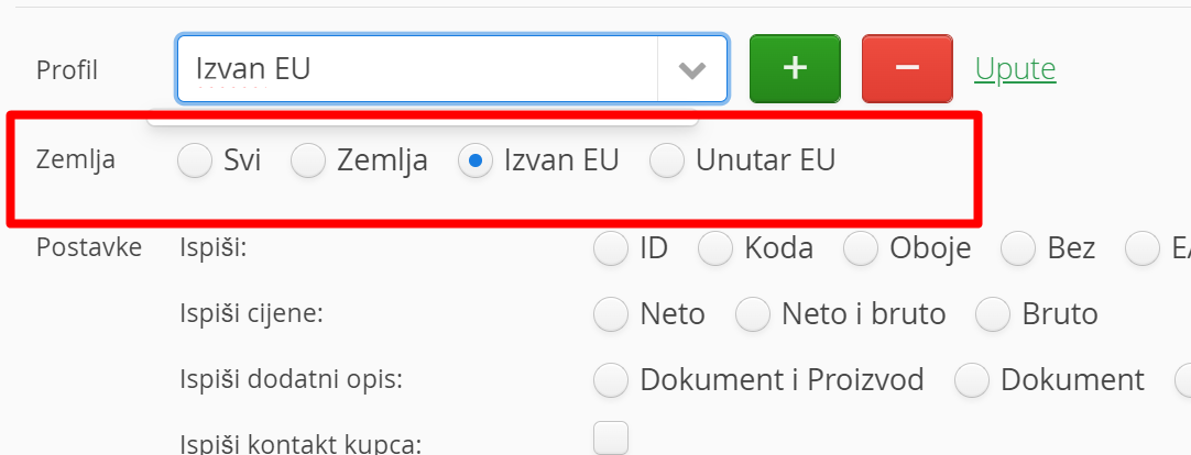 Mogućnost odabira pojedinačnih država, država članica EU i onih koje to nisu, Vam omogućava određivanje računa za EU i izvan EU direktive.