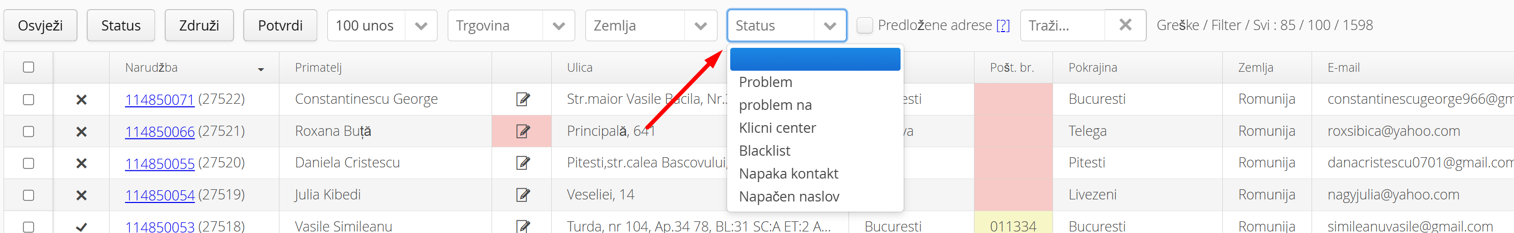 Funkcionalnost omogućava prikaz narudžbi u odabranim statusima u modulu Uređivanje adresa: