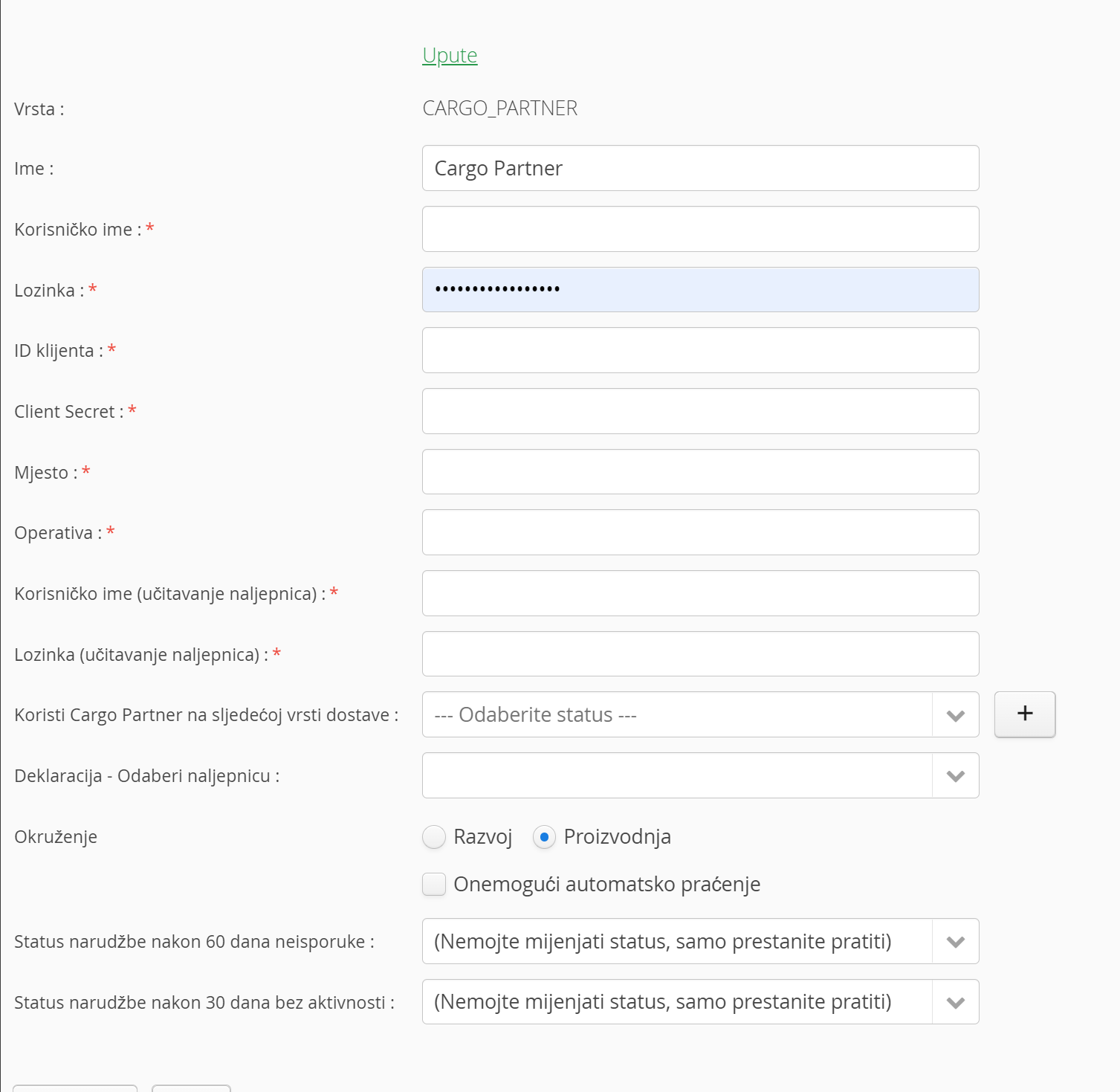 Odredite novu vrstu dostave koju ćete koristiti za CargoPartner, koja se koristi u svrhu pakiranja, možete dodati novo (+)