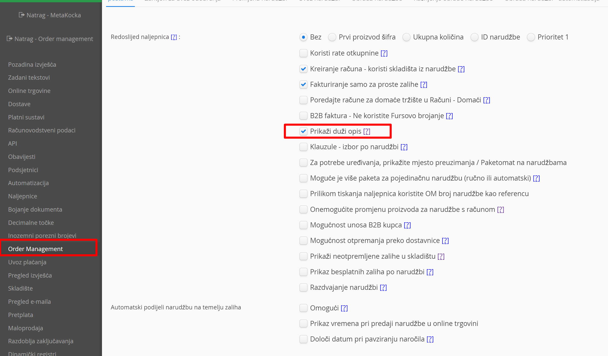 Funkcionalnost Prikaza dužeg opisa omogoćuje prikaz dodatnog opisa kupca na prodajnom nalogu u OrderManagementu. Ukoliko je u dužem nazivu kupca podatak, koji je za vas bitan i želeli bi da se samo on ispiše i na prodajnom nalogu u OrderManagementu, funkcionalnost aktivirajte u dodatnim postavkama/OrderManagement/Prikaži duži opis