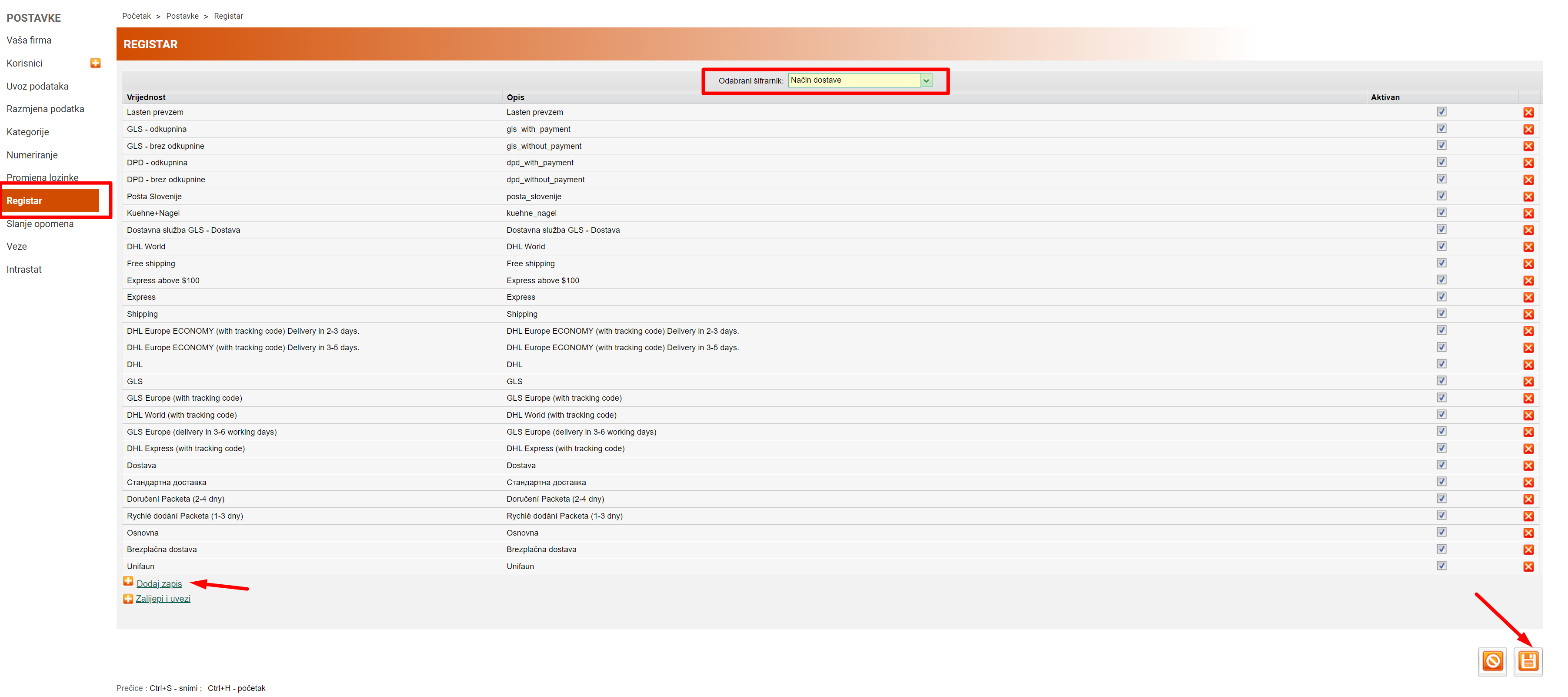 1. Dodavanje dostavne službe u dodatnim postavkama: