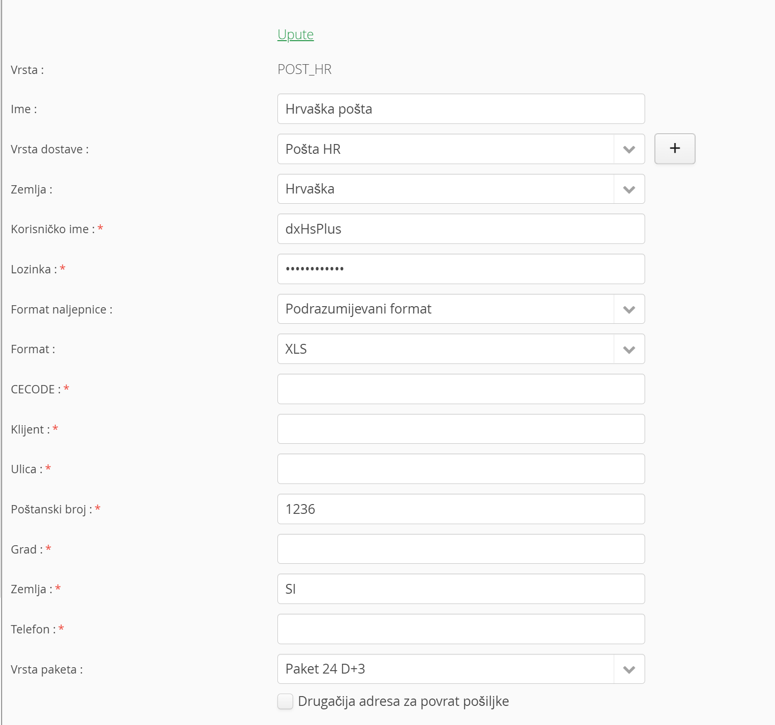 3. Upišite šifru i korisničko ime koje ste primili od Hrvatske pošte, odredite novi način dostave koji ćete koristiti za dostavnu službu Hrvatska Pošta, možete dodati novo (+)