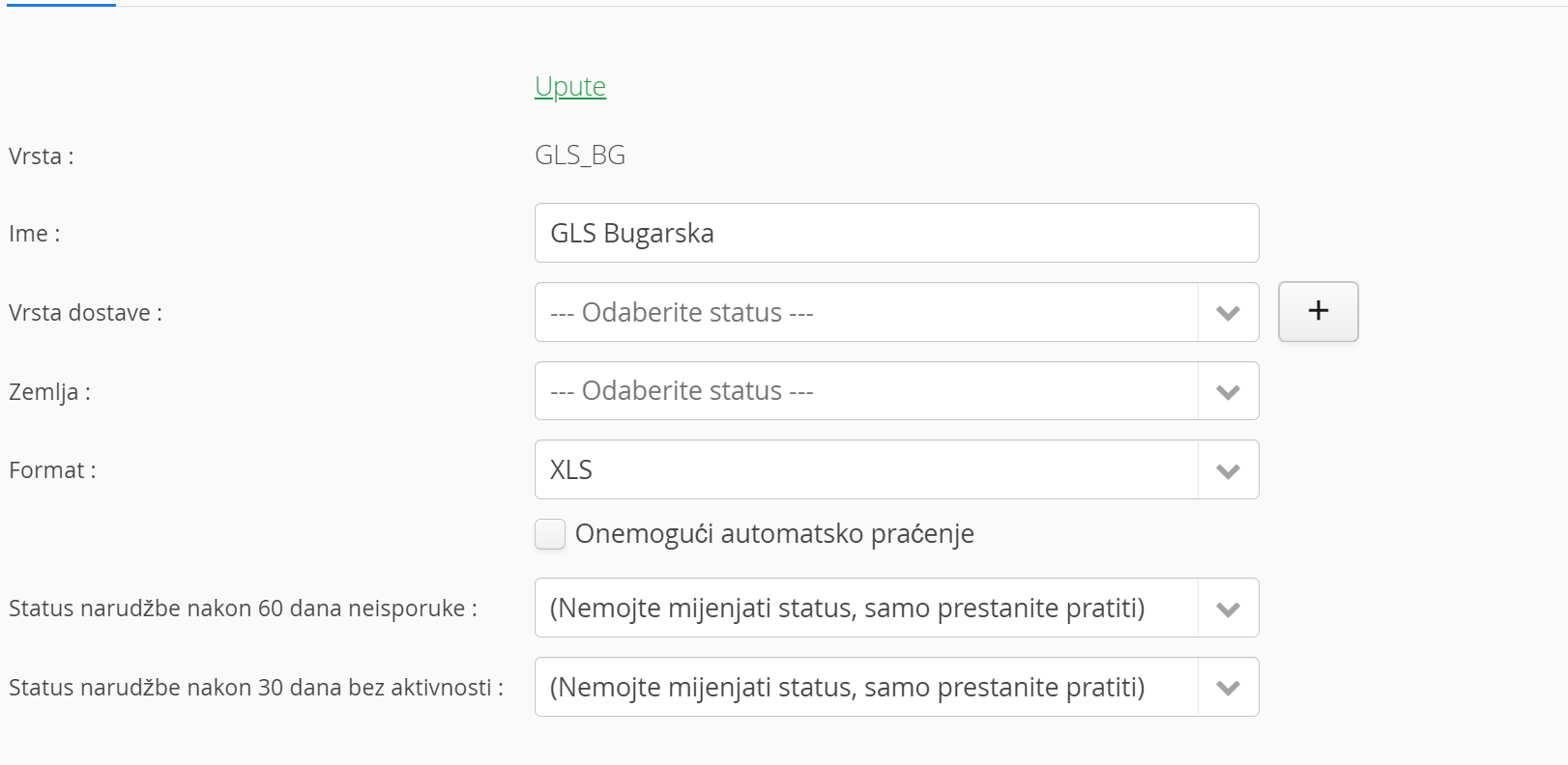 3. Veza omogućava ispis CSV datoteke i ne omogućava automatsko kreiranje prijevoznica, odredite novi način dostave koji ćete koristiti za dostavnu službu GLS Bugarska, možete dodati novo (+)