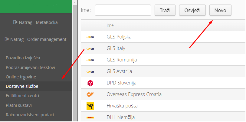 1. Dodavanje dostavne službe u dodatnim postavkama: