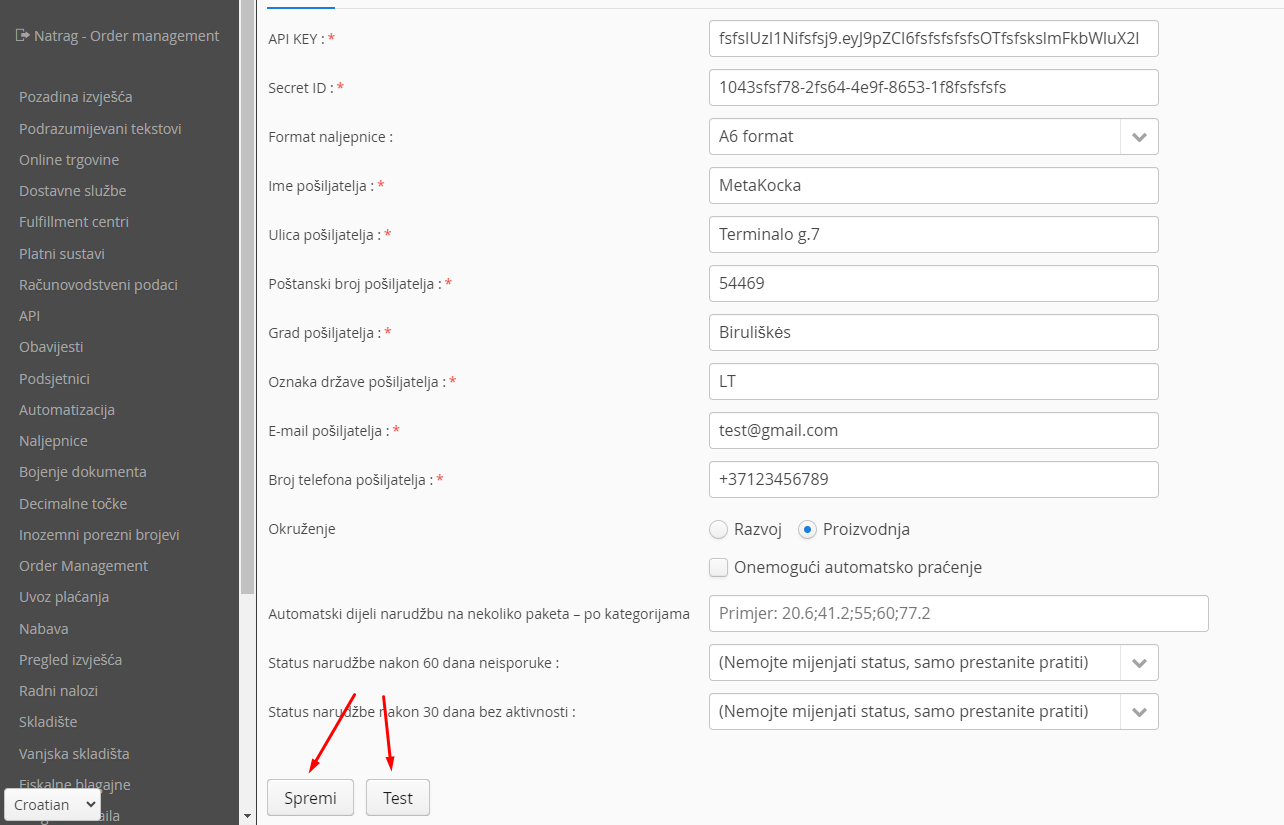 Spremite unesene podatke i klikom na ''Test'' provjerite pravilnost unesenih podataka.