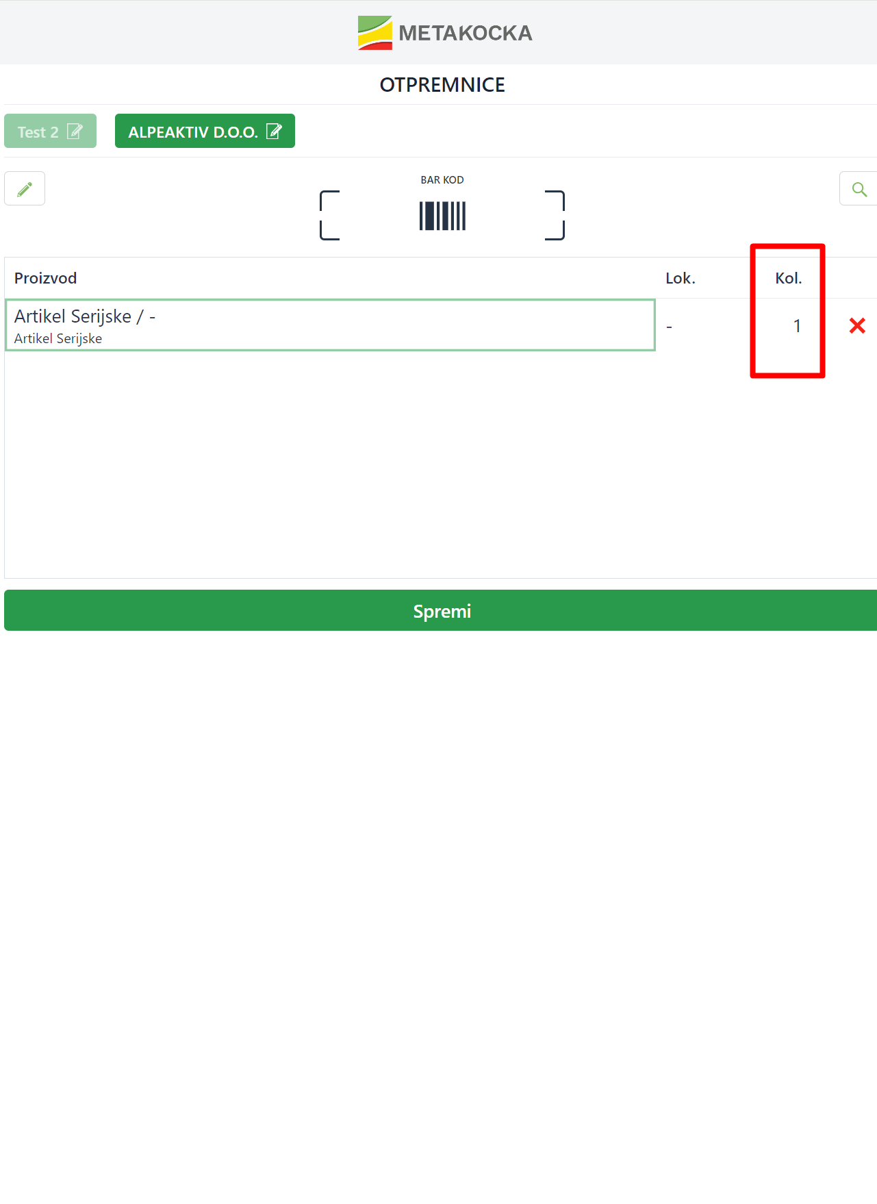 Potvrdite i proizvodi će se prikazati na otpremnici. Ako želite ukloniti proizvod, pritisnite X.