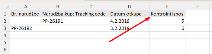 U Excelu, vrijednost mora biti nužno unesena u stupac "E", a stupac mora imati naziv "Kontrolni znesek" (Kontrolni iznos).