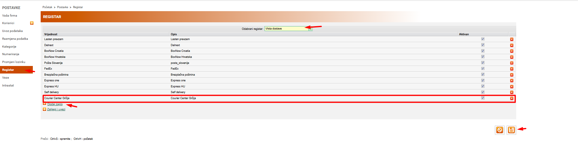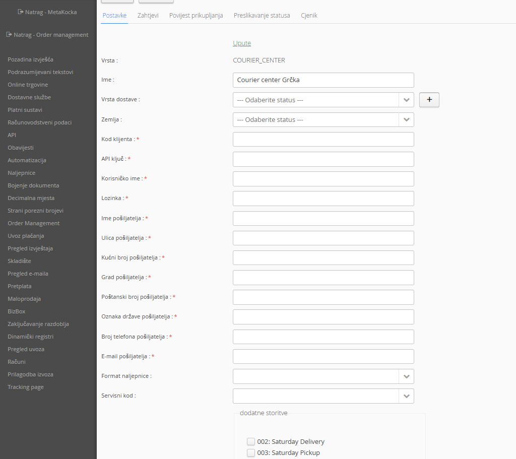Odredite novu vrstu dostave koju ćete koristiti za dostavnu službu Courier Center.