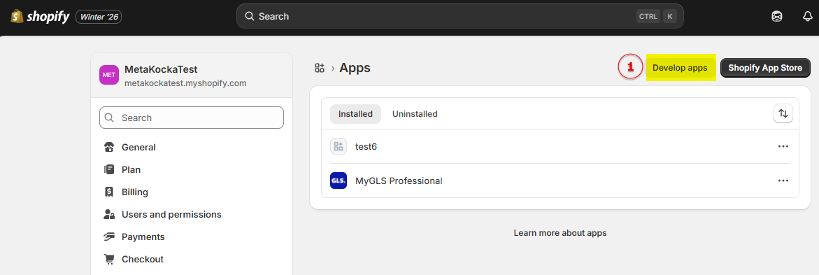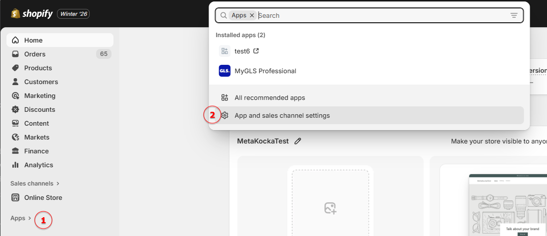Prilikom povezivanja nove trgovine s MetaKockom, prvo započinjemo s pripremom u svojoj nadzornoj ploči trgovine – u lijevom izborniku odaberemo Apps, a zatim u popisu kliknemo App and sales channel settings.
