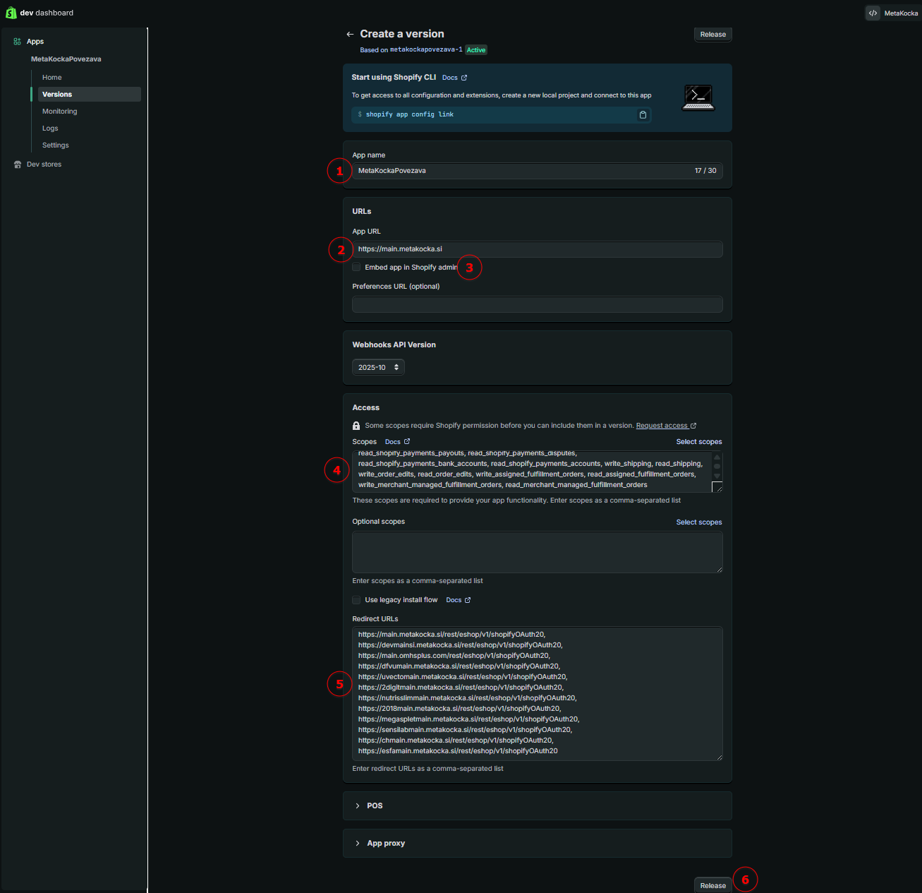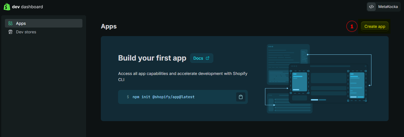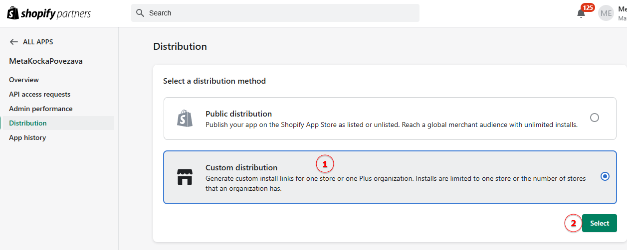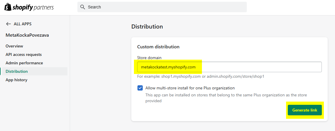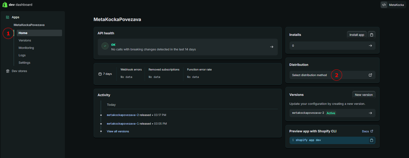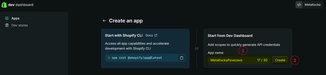 Povezivanje MetaKocke i Shopify u Shopify Developer portalu slično je kao prije, ali zbog politike Shopify-a potrebno je više stvari podesiti ručno.
