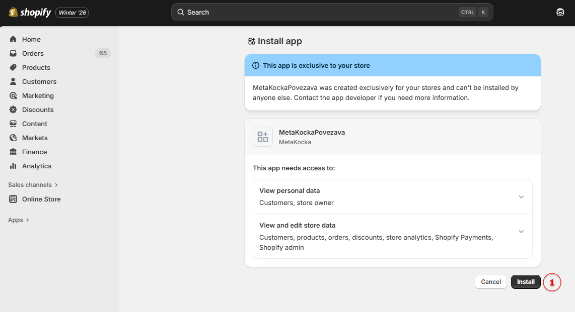 U MetaKocki smo u zadnjem mjesecu za povezivanje sa Shopify pripremili MetaKocka Public App, koji je trenutno još u fazi provjere. Zbog izuzetno kasnog obavještavanja partnera od strane Shopify-a o promjenama u području integracija, trenutno smo na čekanju za odobrenje i ova ćemo uputstva za jednostavnije povezivanje ažurirati čim MetaKocka public app bude dostupan.