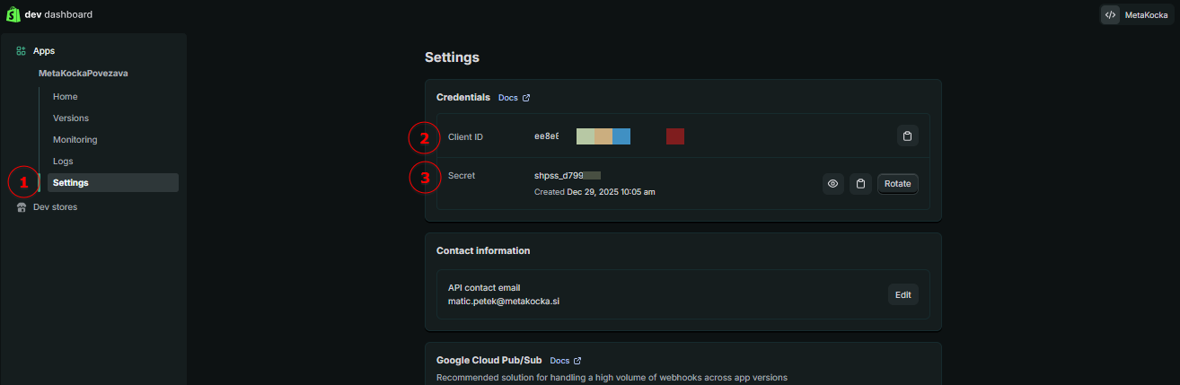 Vraćamo se u Shopify Dev Dashboard, gdje iz postavki kopiramo dva podatka (Client ID i Client Secret):