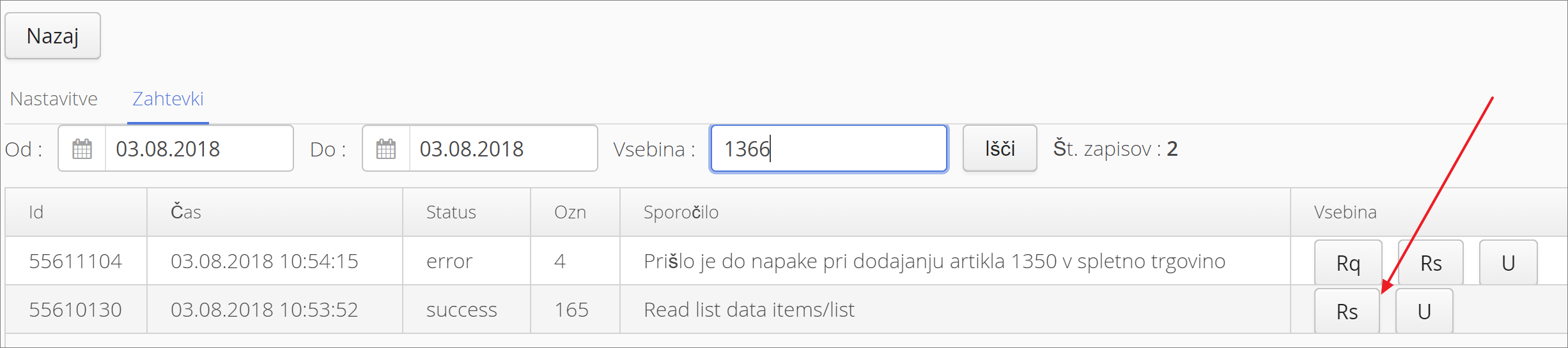 Zahtevek s sporočilom "read list data items / list" vsebuje seznam vseh artiklov v spletni trgovini. Ob kliku na gumb "Rs" dobimo podatke s strukturirani obliki JSON. Če sedaj poiščamo sku številko "1366", bomo videli s katerim artikom se v trgovini prekriva.