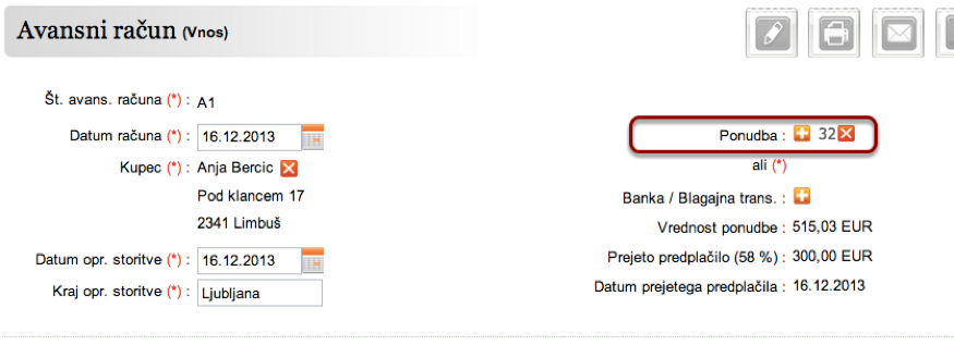 Takoj, ko boste izbrali Ponudbo, ki ima povezano plačilo (predhodno mora biti vnešen bančni izpisek in znesek predplačila povezan z Ponudbo) se v glavi Avansnega računa izpiše kakšna je vrednost Ponudbe in koliko je prejetega predplačila za katerega se izdaja Avansni račun.