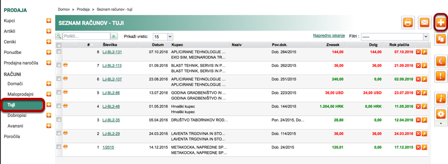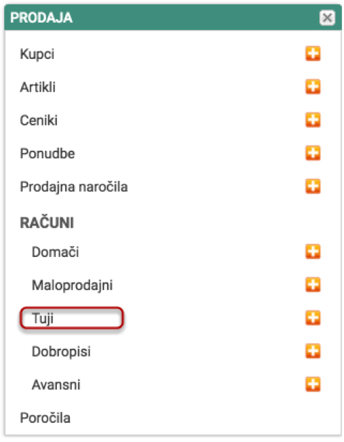 2. Seznam Računov - Tuji - Izberite dodajanje novega Računa