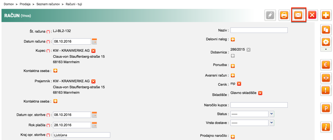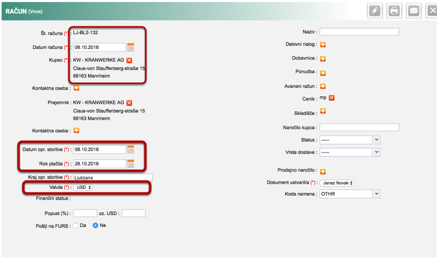 Vnesite podatke v glavi Računa. Obvezna polja so označena z (*)