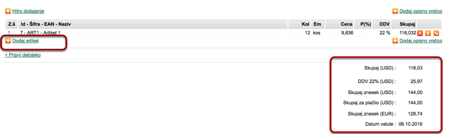 S klikom na "+ Dodaj artikel" dodajate artikle/storitve na Račun in vpišite ceno v izbrani valuti. ( avtomatično se bo naredil preračun v Eur)