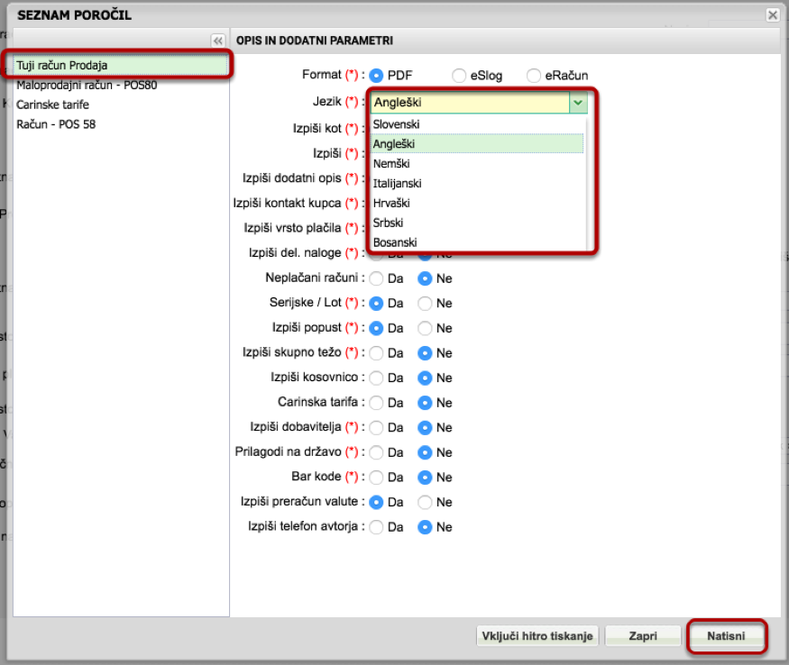 V seznamu poročil izberite "Tuji račun Prodaja", v desnem oknu pa Format izpisa "PDF", jezik, ki je razumljiv vašemu kupcu ter kliknite "Natisni"