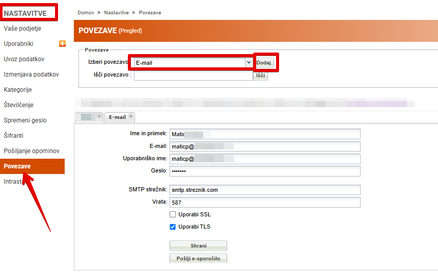 Za pošiljanje e-sporočil smo dodali možnost, da vpišete svoj strežnik za pošiljanje elektronske pošte. Koraki :