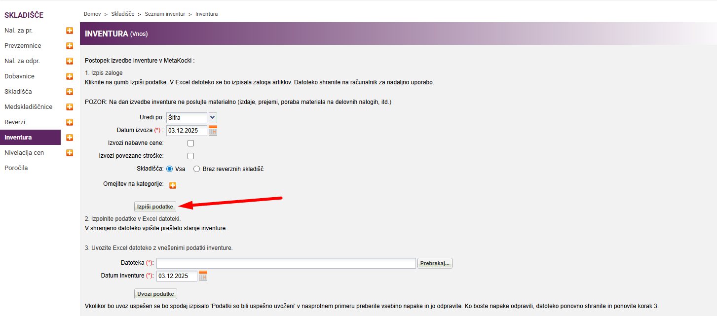 Datoteko v MetaKocki izberite, nastavite datum inventure in kliknite na Gumb "Uvoz podatkov".