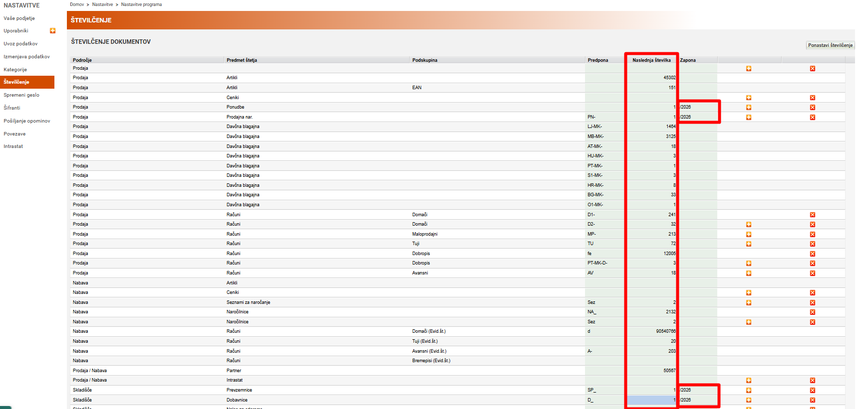 Če začenjate štetje Prodajnih računov - Domačih s številko 1 in uporabljate zapono "-2026" se pri “Prodaja – Računi – Domači” v stolpec "Naslednja številka" vpišete "1" v stolpec "Zapona" pa "-2026". To ponovite pri vseh dokumentih, kjer začenjate s ponovnim štetjem.