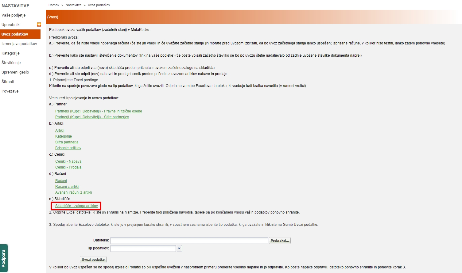 Za uvoz začetne zaloge v Metakocko v "Nastavitvah" kliknete "Uvoz podatkov".