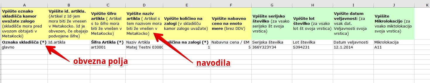 Izvozi se excell tabela v katero vpišete podatke (obvezni stolpci so označeni z poudarjeno pisavo in zvezdico).