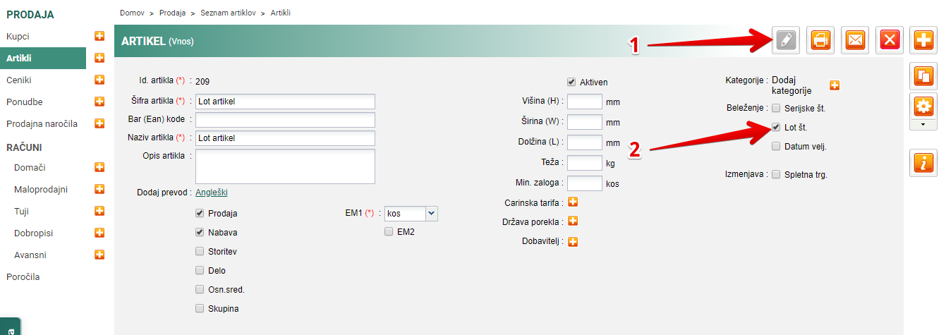 V kolikor želite to omogočiti artiklu, ki je že vnesen v Metakocko, pojdite v Prodaja - Artikli, ga poiščite kliknete uredi in obkljukate LOT št. ter shranite spremembo.