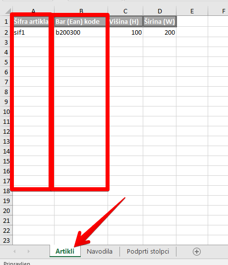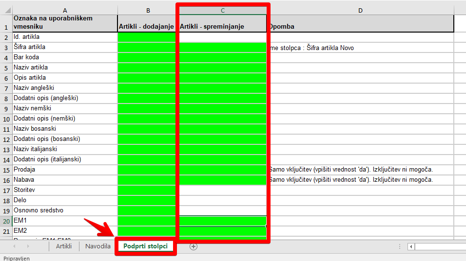Pridobite excell datoteko, kjer imate v listu podprti stolpci imate pod C stolpcem (označeno z zeleno) primere podatkov, katere lahko uvozite (bar kodo, opis artikla, teža,...)