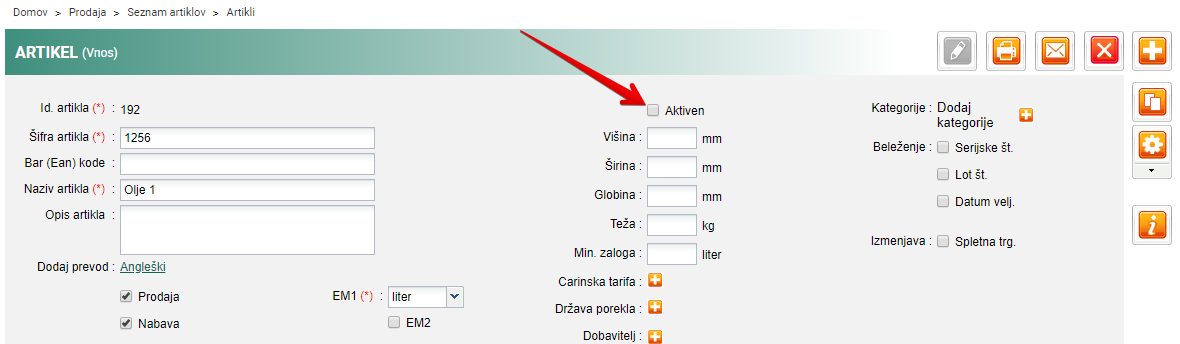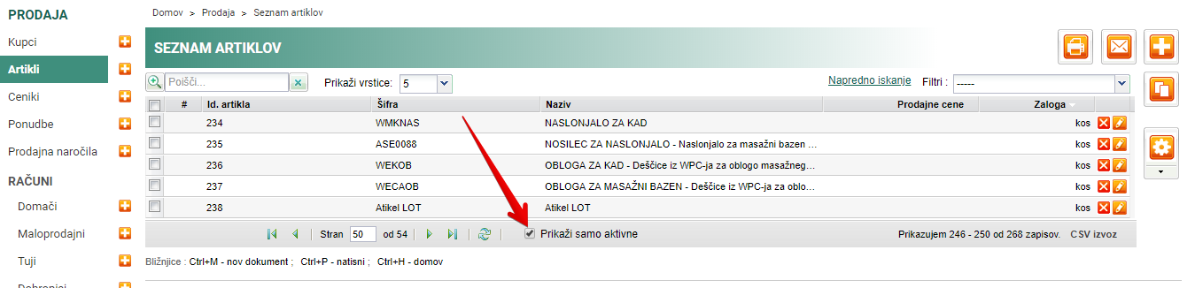 V seznamu Artiklov lahko spodaj obkljukate Prikaži samo aktivne