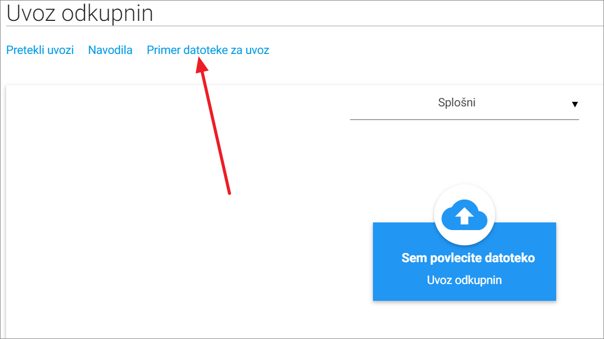 Predlogo uvozne datoteke lahko prenesemo iz aplikacije s klikom na "Primer datoteke za uvoz" ( prikazano spodaj). Pri tem je pomembno, da je vpisan vsaj en identifikator naročila za katerega smo prejeli odkupnino - Št. naročila ali Naročilo kupca iz spletne trgovine ali sledilna številka ( Tracking code) . Če je v tabli vpisanih več podatkov za isto naročilo, se primerjava izvede od leve proti desni. Če datum odkupnine ni podan, potem je enak današnjemu datumu.