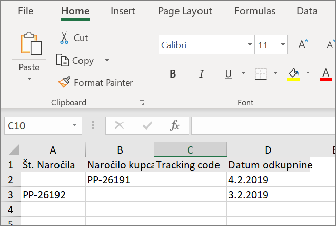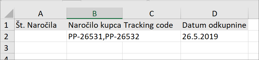 Splošni uvoz odkupnin omogoča, da uporabimo za ta namen pripravljeno Excel datoteko in vanjo kopiramo enega od identifikatorjev naročila ali track kode skupaj z kontrolnim zneskom odkupnine. Ob uspešnem uvozu se naročilo in posledično tudi račun označi kot plačan.