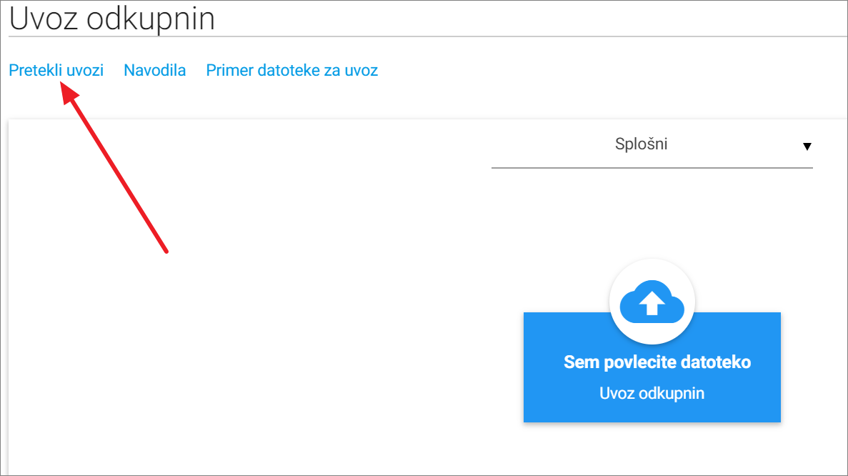 Preko "Dodatnih nastavitev" lahko preverimo tudi stanje preteklih uvozov in pregledamo vsebino uvoza - s klikom na U si lahko prenesete tudi Excel datoteko preteklega uvoza.