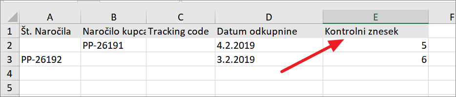 V Excelu mora biti vrednost nujno vnešena v stolpcu "E", stolpec pa mora biti imeti ime "Kontrolni znesek".