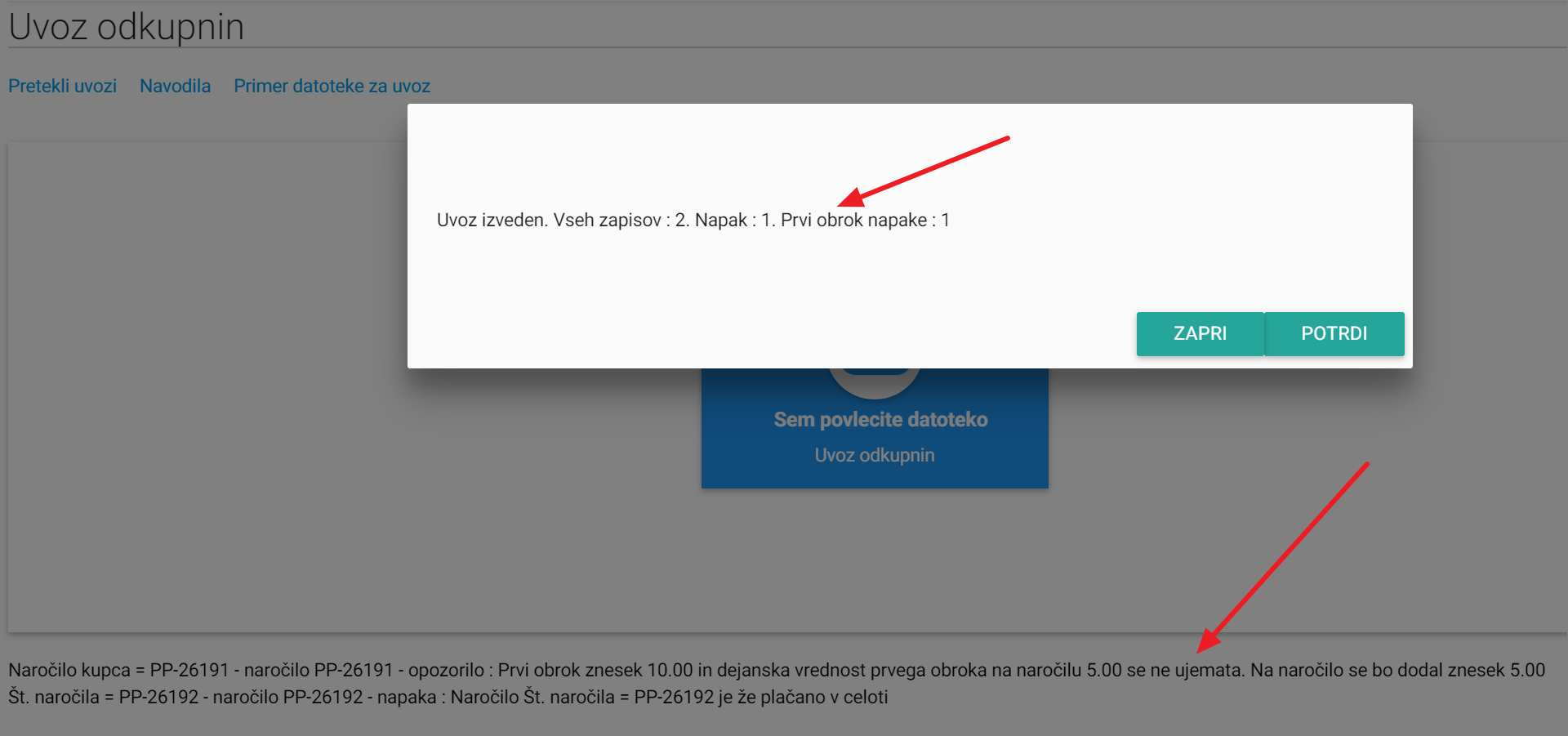 V primeru, da imate v uvozni datoteki napake in bi jih radi popravili direktno v Excel datoteki, lahko potem izvedete ponovni uvoz celotne datoteke. V primeru, da ima naročilo že plačilo, se v primeru novega uvoza ne bo dodalo dodatno plačilo, temveč izpisala spodnja napaka :