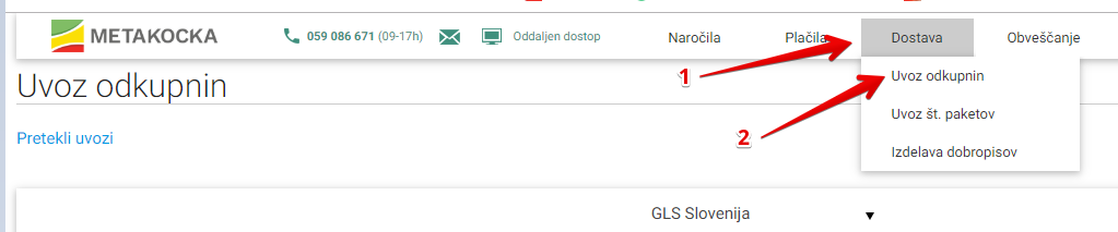 V Ordermanagmentu pojdite v Dostava - uvoz odkupnin
