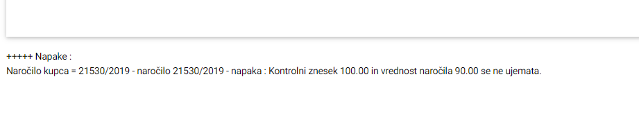 Vnosna datoteka vsebuje tudi stolpec kontolni znesek. Če bi želeli izvesti preverjanje ali je znesek odkupnine enako kot znesek naročila, lahko vrednost vnesete v polje "Kontrolni znesek". V primeru odstopanja se izpiše ustrezno sporočilo o napaki (slika spodaj). V primeru odstopanja se na naročilo ne doda znesek odkupnine.