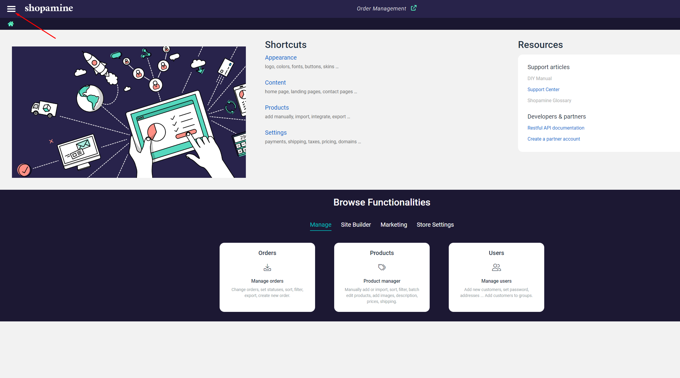 1. Prijavimo se v nadzorno ploščo spletne trgovine Shopamine in s klikom razširimo glavni zgornji levi meni